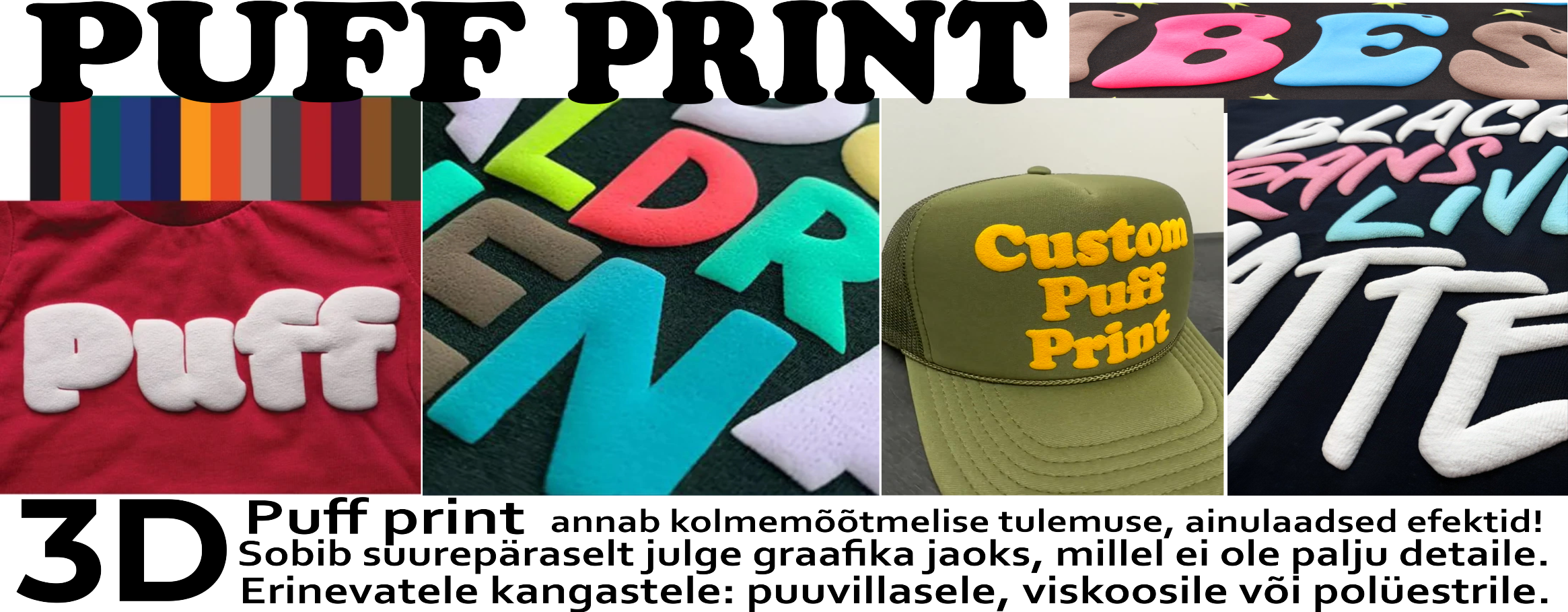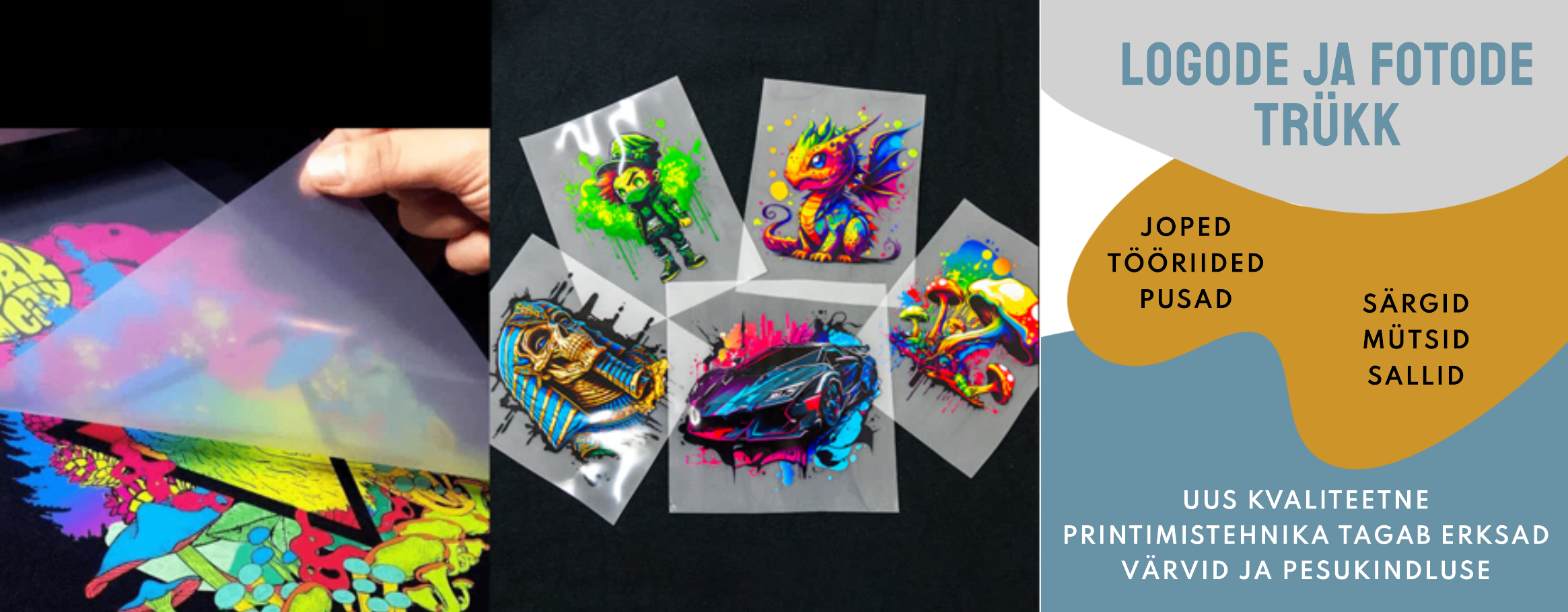 Kasutame kuumpresstrüki meetodit, et kanda teie logo või disain erinevat tüüpi materjalidele. Kuumpresstrükk on suurepärase hinna-kvaliteedi suhtega meetod mis tagab vastupidava tulemuse. Trükki saab teostada järgmistele rõivastele: